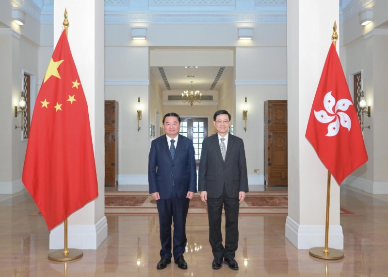 香港特區(qū)行政長(zhǎng)官李家超(右)28日在禮賓府與遼寧省委書(shū)記郝鵬會(huì)面 圖源:政府新聞處