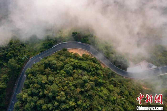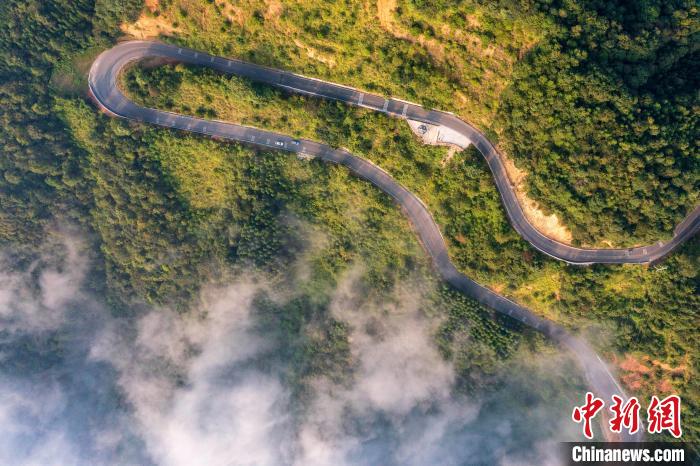 8月28日,貴州省黔東南苗族侗族自治州從江縣谷坪鄉(xiāng)四寨河口至谷坪公路銀下路段出現(xiàn)平流霧,村莊、山林、田園、公路在云霧中時隱時現(xiàn),好一幅鄉(xiāng)村生態(tài)美景畫卷。圖為航拍從江縣谷坪鄉(xiāng)的鄉(xiāng)村公路。吳德軍 攝