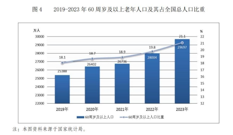 《公報(bào)》披露,截至2023年底,全國60周歲及以上老年人口29697萬人,占總?cè)丝诘?1.1%,其中65周歲及以上老年人口21676萬人,占總?cè)丝诘?5.4%。截至2023年底,全國共有4334.4萬老年人享受老年人補(bǔ)貼,其中享受高齡津貼的老年人3547.8萬人,享受護(hù)理補(bǔ)貼的老年人98.5萬人,享受養(yǎng)老服務(wù)補(bǔ)貼的老年人621.4萬人,享受綜合補(bǔ)貼的老年人66.7 萬人。全國共支出老年福利資金421.7億元,養(yǎng)老服務(wù)資金223.2億元。