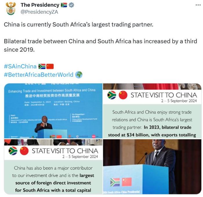 南非總統(tǒng)官方賬號也在峰會期間發(fā)文稱,中國目前是南非最大的貿(mào)易伙伴,南非和中國擁有充滿活力、多元和不斷增長的經(jīng)濟,能夠為希望開拓新市場的企業(yè)提供豐富機遇。