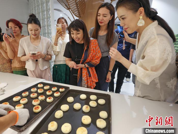 9月10日,臺(tái)胞臺(tái)屬們跟隨稻香村傳統(tǒng)糕點(diǎn)制作技藝傳承人學(xué)做蘇式月餅。 中新社記者 泱波 攝