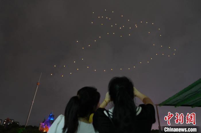 圖為工人家屬觀賞無(wú)人機(jī)組成的玉兔圖案。中新社記者 楊華峰 攝