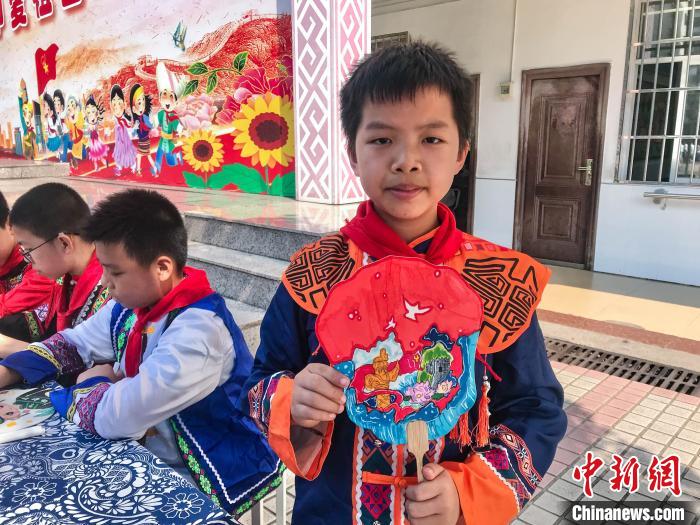 中新網(wǎng)桂林9月13日電(蔣豐慧 歐惠蘭 林浩)“今天我們體驗繪制團扇,我畫了中國的建筑。”9月13日,在廣西桂林市象山區(qū)翠竹小學,六年級的瑤族學生褚浩宇為自己繪制的長城填色,并向記者展示團扇作品。