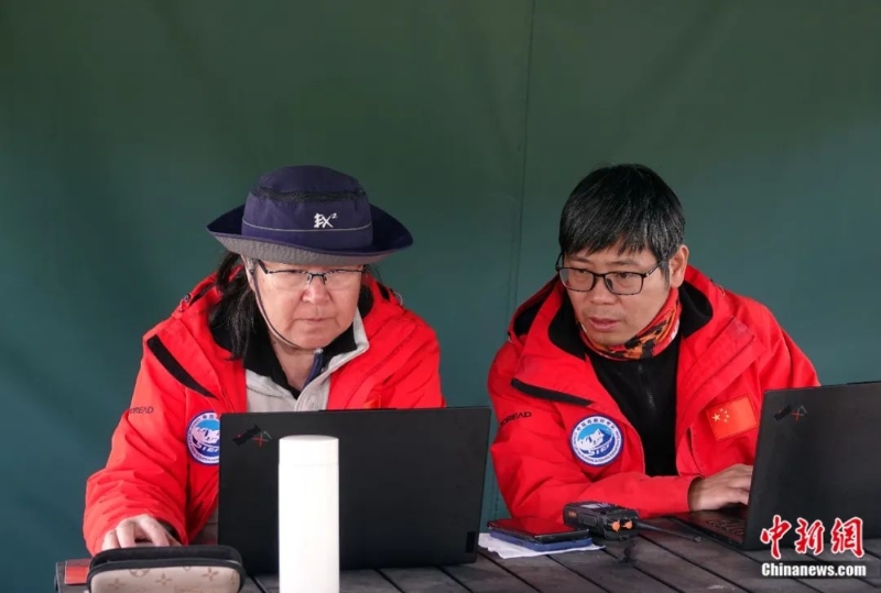 珠峰地區(qū)首次水—熱—碳通量航空觀測(cè)試驗(yàn)科研團(tuán)隊(duì)負(fù)責(zé)人賈立研究員(左),在試驗(yàn)場(chǎng)指帳篷內(nèi)與科考隊(duì)員討論觀測(cè)方案。中新社記者 孫自法 攝