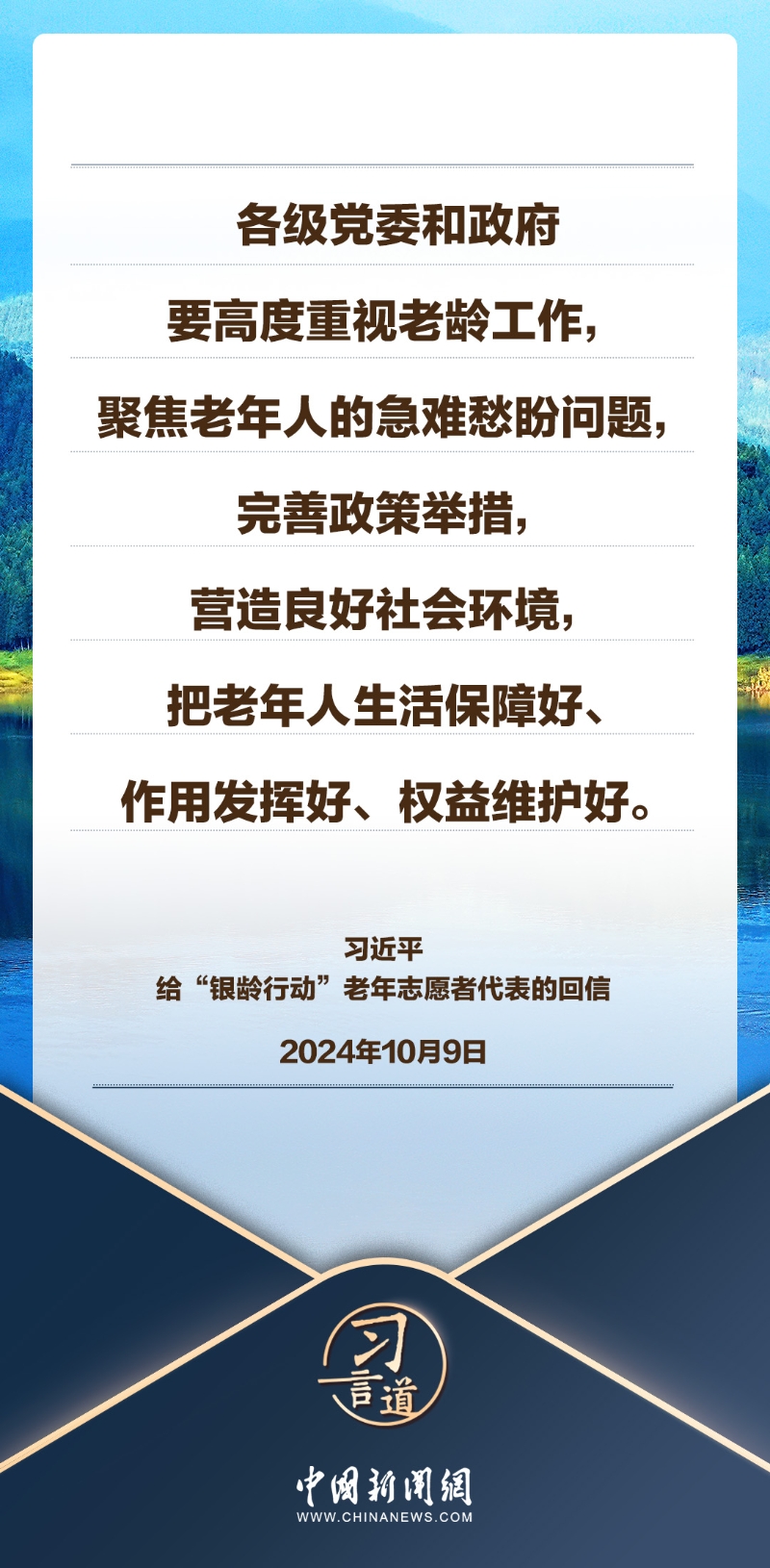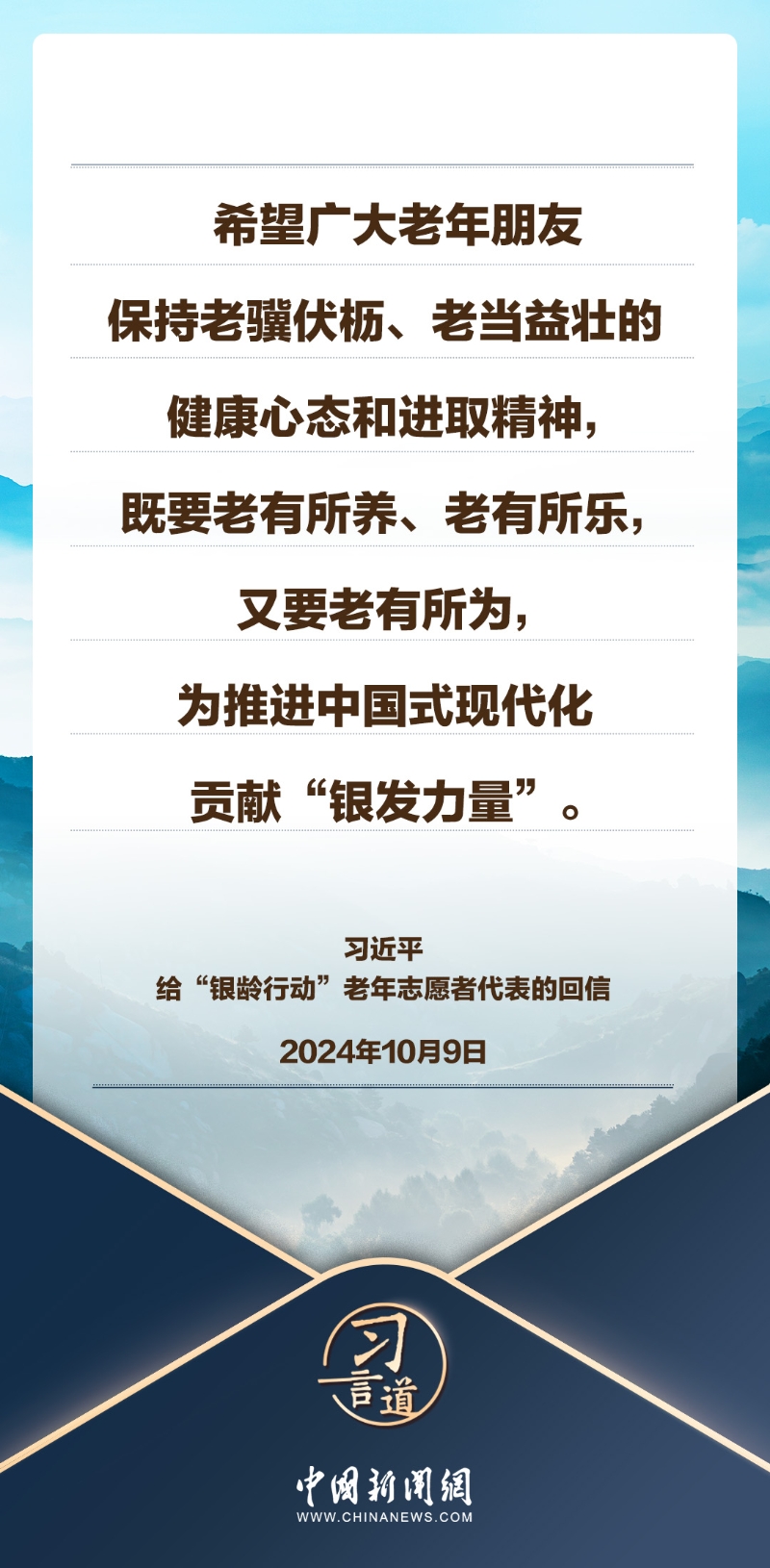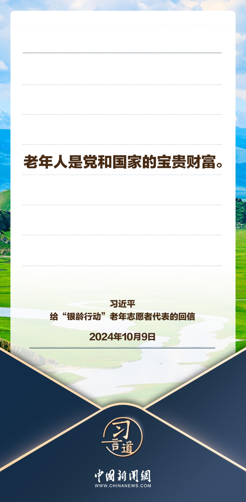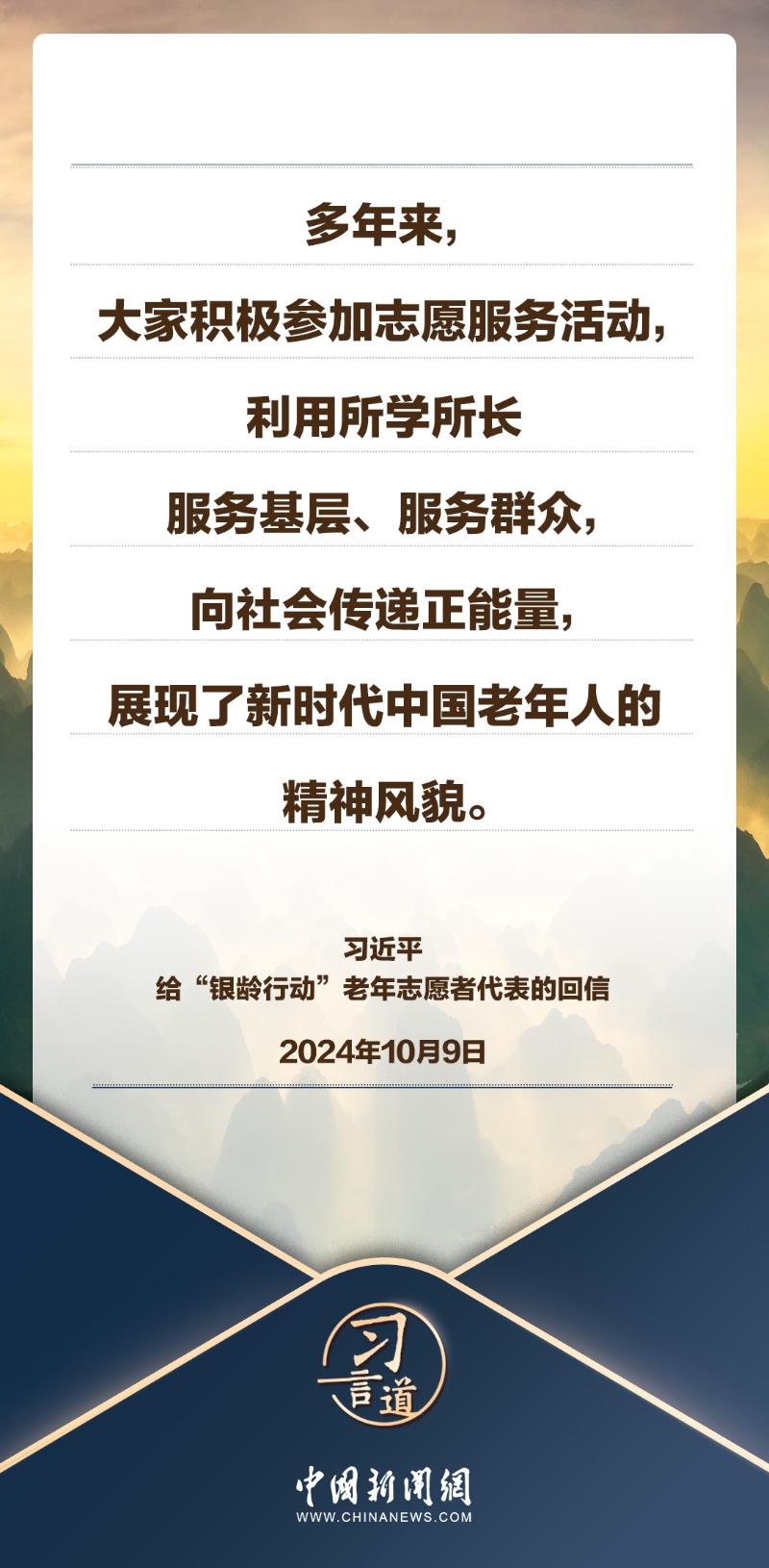 在中華民族傳統(tǒng)節(jié)日重陽節(jié)來臨之際,中共中央總書記、國家主席、中央軍委主席習(xí)近平給“銀齡行動”老年志愿者代表回信,對他們予以親切勉勵,向全國的老年人致以誠摯問候。習(xí)近平指出——