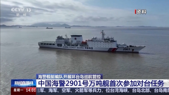 14日,中國海警局組織艦艇編隊前往臺灣本島、東引島、馬祖島附近海域開展執(zhí)法巡查,環(huán)臺島巡航管控。其中,海警2901號萬噸艦首次參加對臺任務(wù)。
