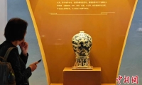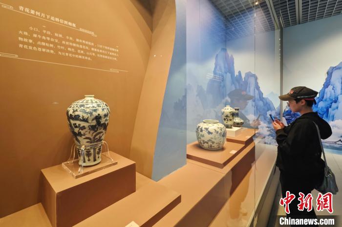10月15日,江蘇南京,觀眾在六朝博物館舉辦的“只此中國(guó)色——青”特展上欣賞青花蕭何月下追韓信圖梅瓶。該展以中國(guó)特有的青色為主題,展出玉器、瓷器、書畫、服飾等180余件文物,展現(xiàn)色彩美學(xué),弘揚(yáng)中華優(yōu)秀傳統(tǒng)文化。中新社記者 泱波 攝