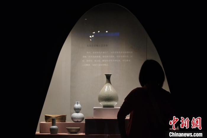 10月15日,江蘇南京,觀眾在六朝博物館舉辦的“只此中國(guó)色——青”特展上欣賞粉青釉模印纏枝花卉夔鳳蓮蓬口瓶(右一)、仿汝釉雙耳抱月瓶(右二)、粉青釉印折枝花果紋大碗(右三)等文物。該展以中國(guó)特有的青色為主題,展出玉器、瓷器、書畫、服飾等180余件文物,展現(xiàn)色彩美學(xué),弘揚(yáng)中華優(yōu)秀傳統(tǒng)文化。中新社記者 泱波 攝