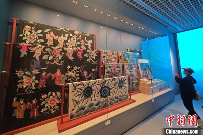 10月15日,江蘇南京,觀眾在六朝博物館舉辦的“只此中國(guó)色——青”特展上欣賞蜀繡燈彩繡蘭花桌圍、蜀繡長(zhǎng)壽富貴平金桌圍等展品。該展以中國(guó)特有的青色為主題,展出玉器、瓷器、書畫、服飾等180余件文物,展現(xiàn)色彩美學(xué),弘揚(yáng)中華優(yōu)秀傳統(tǒng)文化。中新社記者 泱波 攝