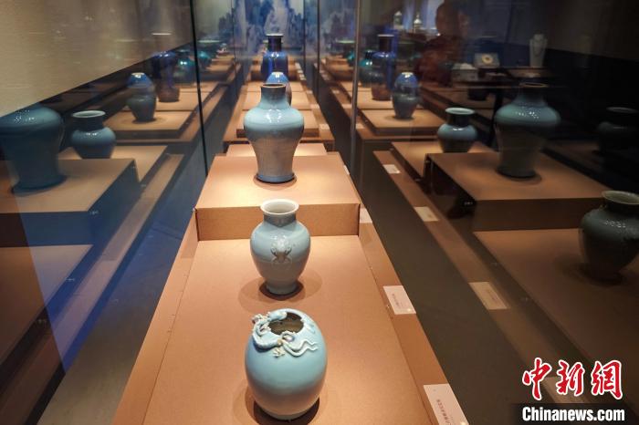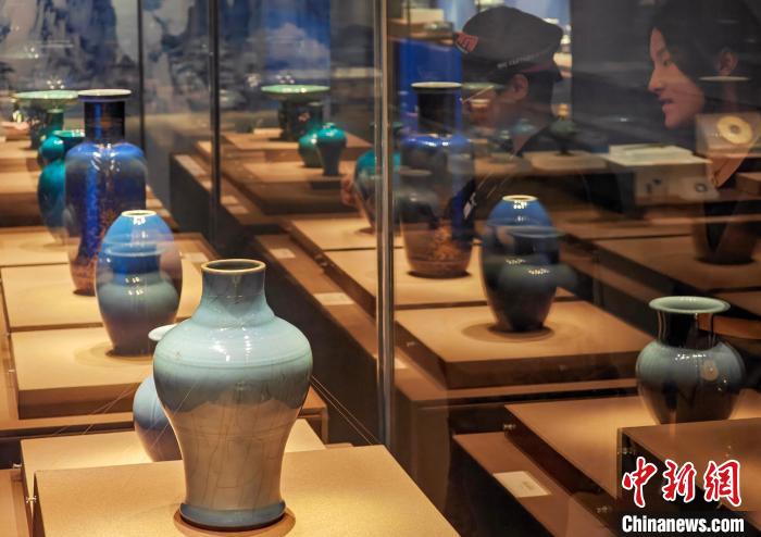 10月15日,江蘇南京,觀眾在六朝博物館舉辦的“只此中國(guó)色——青”特展上欣賞天青釉螭虎紋瓷器、藍(lán)釉瓷瓶等展品。該展以中國(guó)特有的青色為主題,展出玉器、瓷器、書畫、服飾等180余件文物,展現(xiàn)色彩美學(xué),弘揚(yáng)中華優(yōu)秀傳統(tǒng)文化。中新社記者 泱波 攝