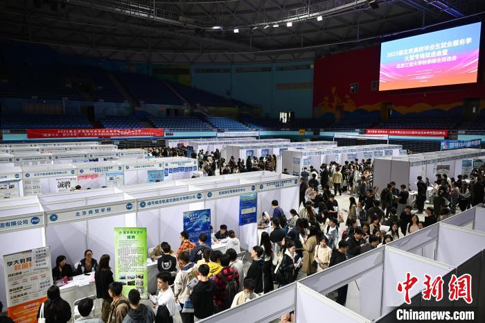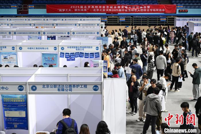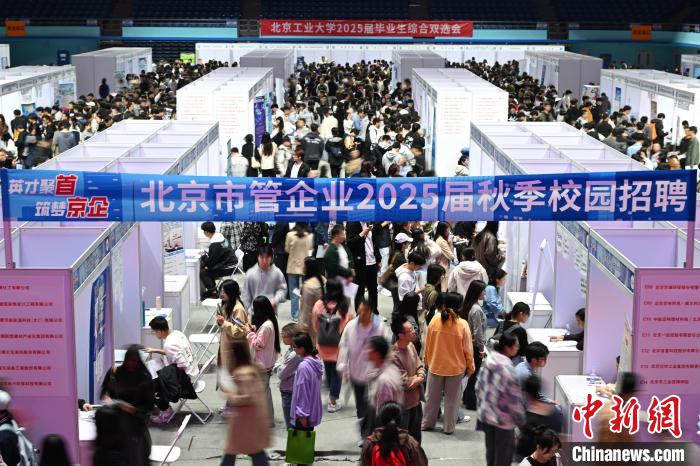 10月16日,北京市教委在北京工業(yè)大學(xué)舉辦2025屆北京高校畢業(yè)生就業(yè)服務(wù)季啟動(dòng)儀式。2025屆北京高校畢業(yè)生就業(yè)服務(wù)季校企對接會(huì)和大型雙選會(huì)同期舉辦。校企對接會(huì)現(xiàn)場,70余所北京高校與40余家用人單位開展深度洽談,精準(zhǔn)對接2025屆招聘需求,加強(qiáng)校企合作,深化產(chǎn)教融合。雙選會(huì)現(xiàn)場,3000余名高校畢業(yè)生與近200家用人單位面對面溝通交流,投遞簡歷和參加現(xiàn)場面試。圖為用人單位與畢業(yè)生在雙選會(huì)上交流。中新社記者 田雨昊 攝