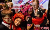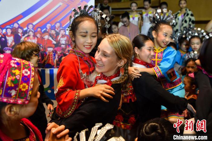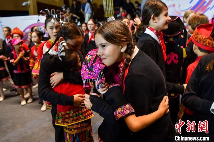 10月27日,“中法童聲合唱友誼之橋”活動的最后一場演出在海南省五指山市水滿鄉(xiāng)毛納村舉行。來自法國的巴黎寶麗聲童聲合唱團與海南五指山黎苗童聲合唱團共同唱響“友誼合聲”,一起聽黎歌、賞黎錦、跳黎舞。圖為演出結(jié)束后,中法兩國小朋友相互擁抱。中新社記者 駱云飛 攝