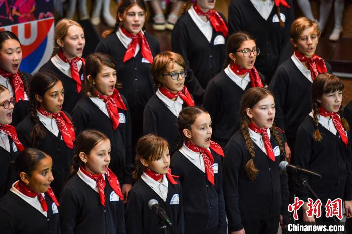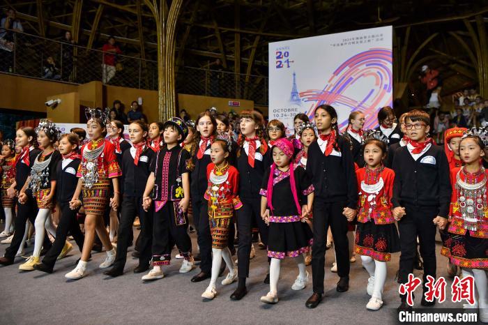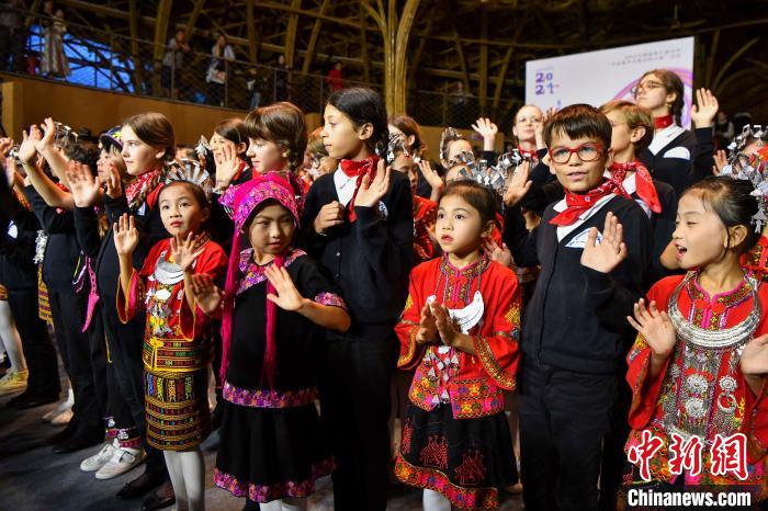 圖為巴黎寶麗聲童聲合唱團和海南五指山黎苗童聲合唱團再次合唱經(jīng)典歌曲《友誼地久天長》。中新社記者 駱云飛 攝