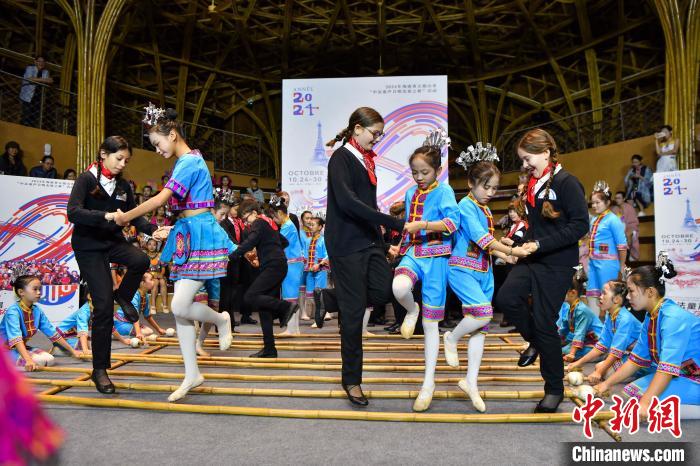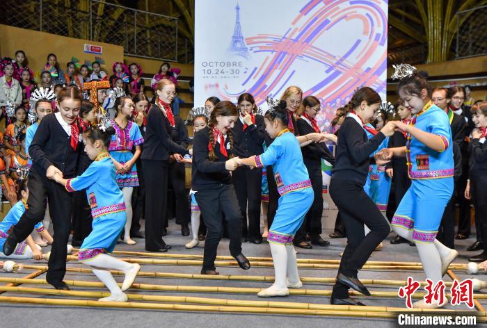 圖為巴黎寶麗聲童聲合唱團的小朋友體驗竹竿舞。中新社記者 駱云飛 攝