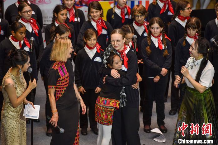 圖為五指山黎苗童聲合唱團成員王茹涵與巴黎寶麗聲童聲合唱團成員瑪戈特擁抱。中新社記者 駱云飛 攝