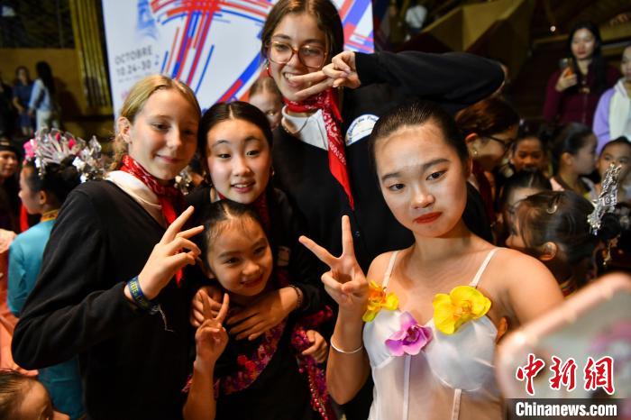 圖為演出結(jié)束后中法兩國小朋友用手機自拍合影。中新社記者 駱云飛 攝