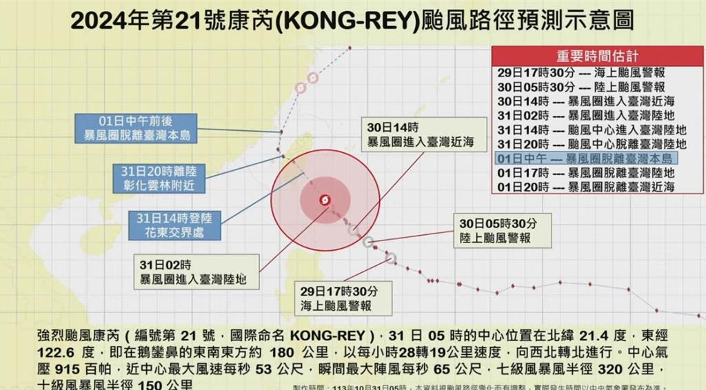 災(zāi)害應(yīng)變中心上午9時召開第5次工作會報?!翱的荨憋L(fēng)雨影響預(yù)計今日至明日清晨最為顯著,目前蘭嶼、綠島已有14級以上強陣風(fēng),宜蘭、花蓮、臺東將有局部豪雨等級以上降雨發(fā)生,臺島北部、南部地區(qū)及中部山區(qū)亦有大雨或豪雨,今日臺風(fēng)中心登陸后并持續(xù)西移至臺灣海峽的過程,南部地區(qū)雨勢增大,中部地區(qū)降雨亦稍增加,另外提醒民眾各沿海易有長浪發(fā)生,請避免前往海邊活動。