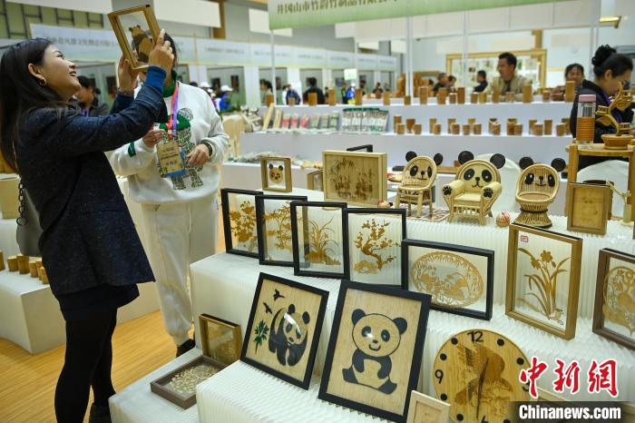 11月11日,四川青神,竹子制作的“熊貓”等工藝品擺件等吸引參觀者。中新社記者 劉忠俊 攝
