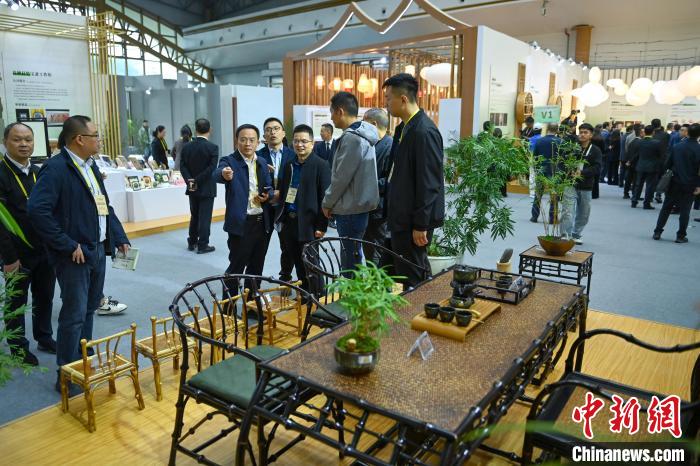 11月11日,四川青神,竹子家居產(chǎn)品吸引參觀者駐足。中新社記者 劉忠俊 攝