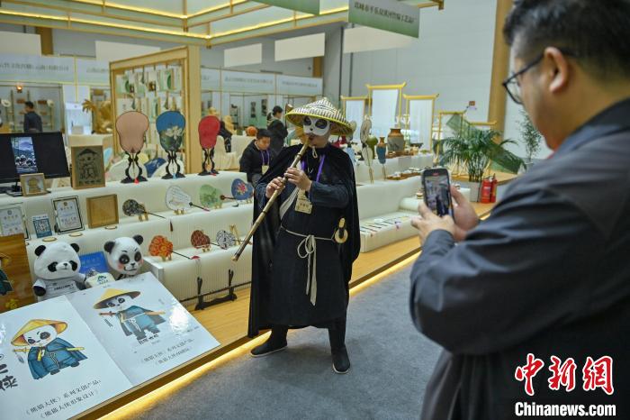 11月11日,四川青神,展臺(tái)前張偉裝扮成“熊貓”大俠并展示自己的文創(chuàng)產(chǎn)品。中新社記者 劉忠俊 攝
