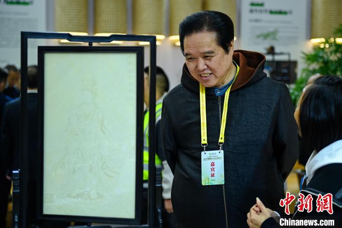 11月11日,四川青神,竹絲編織的《隱形觀音》吸引參觀者。中新社記者 劉忠俊 攝