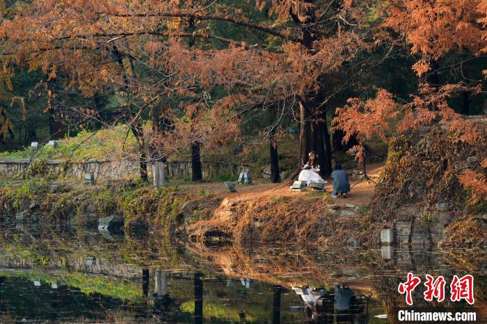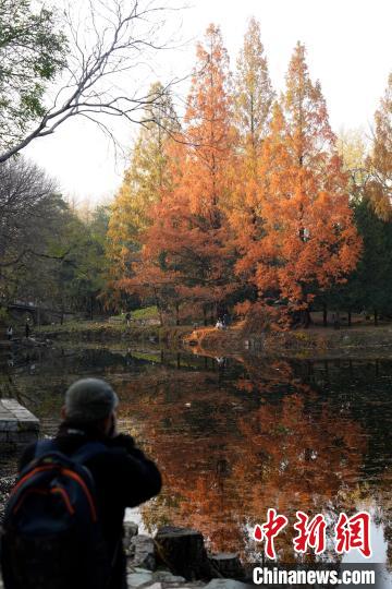 11月14日,北京天氣晴好,頤和園秋色吸引游客觀賞、拍照。圖為游客在頤和園后湖賞秋景。中新社記者 張祥毅 攝