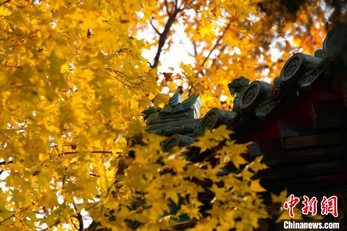 11月14日,北京天氣晴好,頤和園秋色吸引游客觀賞、拍照。圖為頤和園楓葉與古建筑同框。中新社記者 張祥毅 攝
