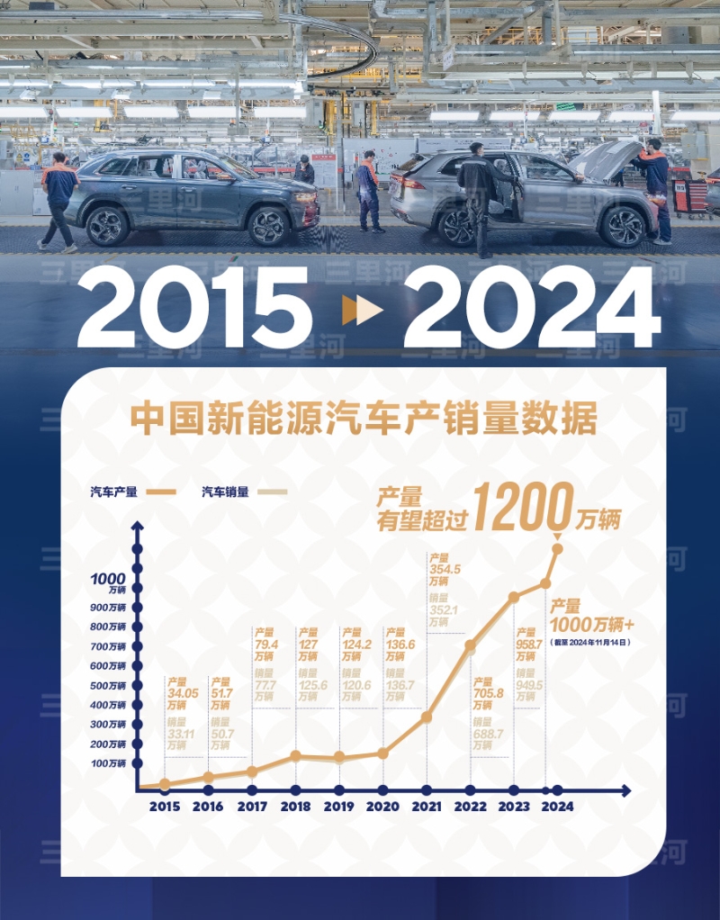 從2009年的“十城千輛”規(guī)模推廣起步,到2018年年產(chǎn)銷量超百萬輛,中國用了近10年時間;2022年年產(chǎn)銷量逾500萬輛,用時約4年;2024年產(chǎn)量突破千萬輛,僅約2年。