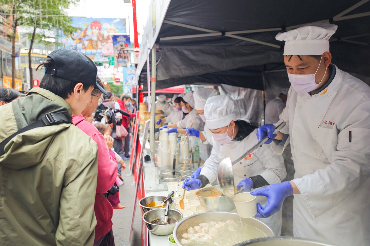 活動現(xiàn)場,來自三明沙縣的14位小吃技藝傳承人采用臺灣本地食材,現(xiàn)場制作拌面、扁肉、水晶燒賣、烙粑、金包銀等一系列經(jīng)典小吃,品種豐富、風(fēng)味地道的沙縣小吃吸引了眾多臺灣民眾排隊品嘗。