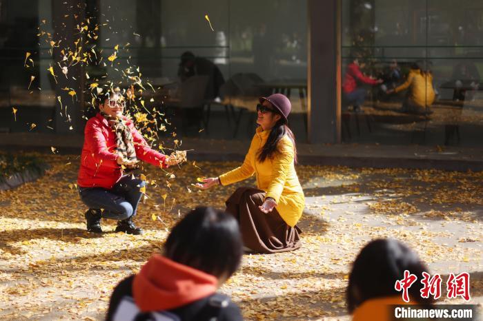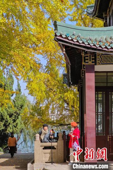 11月27日,江蘇南京,市民在玄武湖梁洲銀杏大道上拍攝照片。近日,這里的銀杏樹葉“披”上金裝,迎來最佳觀賞期。中新社記者 泱波 攝