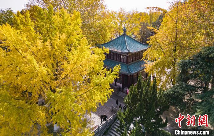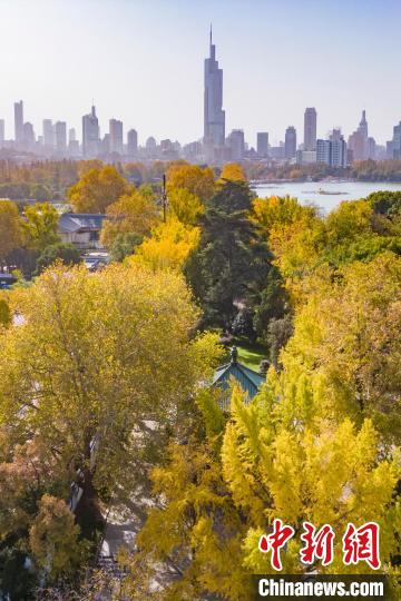 11月27日,江蘇南京,航拍玄武湖梁洲銀杏大道。近日,這里的銀杏樹葉“披”上金裝,迎來最佳觀賞期。(無人機(jī)照片)中新社記者 泱波 攝