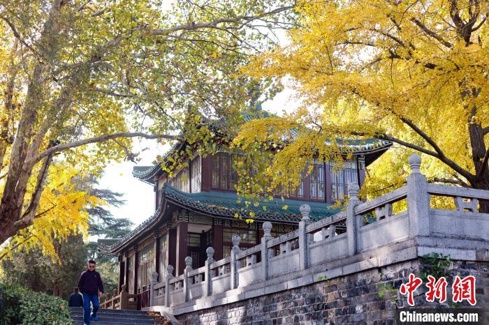 11月27日,江蘇南京,市民在玄武湖梁洲銀杏大道上觀賞銀杏。近日,這里的銀杏樹葉“披”上金裝,迎來最佳觀賞期。中新社記者 泱波 攝