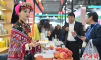 11月28日,廣東省廣州市,第二十一屆中國國際農(nóng)產(chǎn)品交易會開幕。本屆農(nóng)交會以“加快發(fā)展現(xiàn)代農(nóng)業(yè) 推進鄉(xiāng)村全面振興”為主題,展覽面積超10萬平方米,近3000家企業(yè)攜2萬余種展品參展。圖為四川甘孜州的蘋果吸引采購商品嘗。中新社記者 陳楚紅 攝