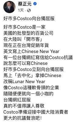 對于此次“Chinese New Year”改為“Lunar New Year”,不少臺灣知名人士也發(fā)表看法。臺灣立法機(jī)構(gòu)前民意代表蔡正元發(fā)帖指,好市多向“臺獨(dú)”屈服,真的不值得讓人尊敬,并認(rèn)為只憑一個(gè)小咖的“臺獨(dú)”網(wǎng)紅抗議,就把中國新年“Chinese New Year”改成“Lunar New Year”,是無知加愚蠢的做法。