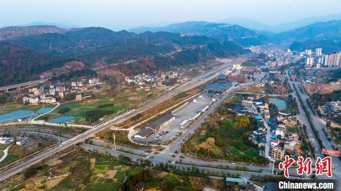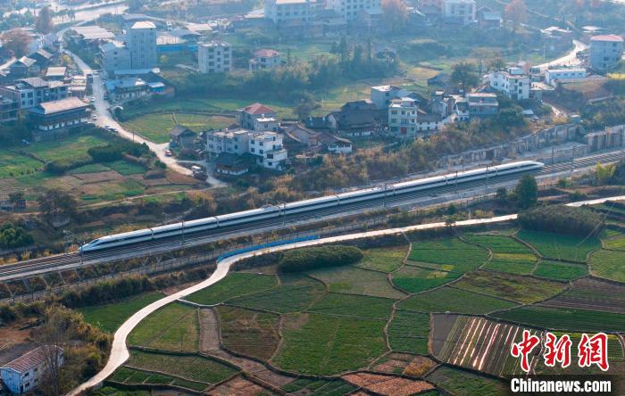 12月26日,貴廣高鐵迎來全線開通運營十周年。貴廣高鐵是貴州首條高速鐵路,開通十年來,極大地方便了沿線地區(qū)民眾的出行,有力推動了沿線地區(qū)經濟社會發(fā)展。2023年10月11日,貴廣高鐵完成提質改造,最高時速按300公里運營。圖為一列動車組列車駛出貴廣高鐵貴州省從江站(無人機照片)。吳德軍 攝