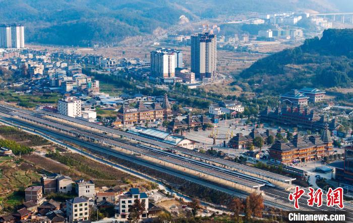 圖為一列動車組列車在貴廣高鐵貴州省從江站???無人機照片)。吳德軍 攝