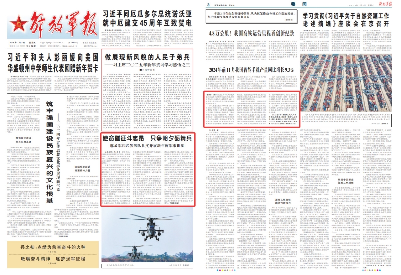 鐵翼飛旋,陸軍某旅新年度首次飛行訓(xùn)練即瞄準(zhǔn)險難課目,在海上排兵布陣。復(fù)雜海況下,直升機(jī)大機(jī)群編隊掠海出擊,展開遠(yuǎn)距離超低空突防訓(xùn)練。導(dǎo)彈起豎,火箭軍某旅一場全流程發(fā)射訓(xùn)練在不同點位同時拉開戰(zhàn)幕,該旅按照實戰(zhàn)要求展開專攻精練,錘煉全時全域戰(zhàn)備能力。屏幕閃爍,信息支援部隊某部展開全要素全體系訓(xùn)練,各分隊快速穿插,迅速抵達(dá)某地域建立多個戰(zhàn)場信息節(jié)點,接入數(shù)百公里之外的作戰(zhàn)數(shù)據(jù)平臺,確保各軍兵種作戰(zhàn)數(shù)據(jù)與某區(qū)域聯(lián)合作戰(zhàn)指揮中心實時聯(lián)動。