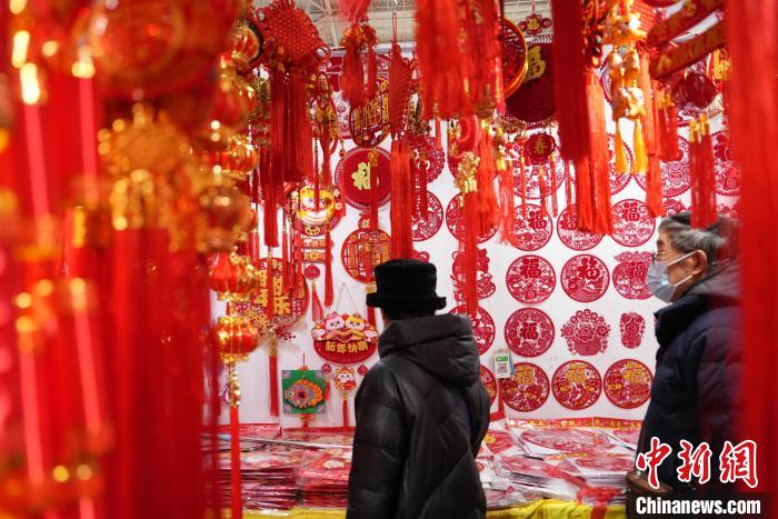 1月3日,第29屆老北京年貨大集在位于北京的全國農(nóng)業(yè)展覽館開市。圖為民眾在大集上采買年符。中新社記者 張祥毅 攝