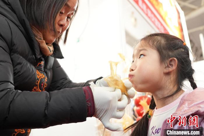 1月3日,第29屆老北京年貨大集在位于北京的全國農(nóng)業(yè)展覽館開市。圖為小朋友在吹糖人。中新社記者 張祥毅 攝