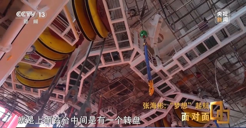 張海彬:上面鉆臺(tái)中間是有一個(gè)轉(zhuǎn)盤,將來在鉆探的時(shí)候,鉆桿就是通過這個(gè)轉(zhuǎn)臺(tái)上面連接,通過中間的孔洞伸到海底,每根鉆桿長(zhǎng)度是9.5米,需要一千多根,總共是可以達(dá)到11000米。