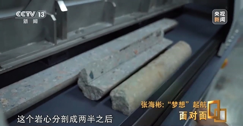 張海彬:切割完差不多就是1.5米的長(zhǎng)度,這個(gè)巖心分剖成兩半之后,其中一半是運(yùn)到船的巖心庫,另外一半就會(huì)運(yùn)到外面的這個(gè)基礎(chǔ)地質(zhì)研究室進(jìn)行分析。