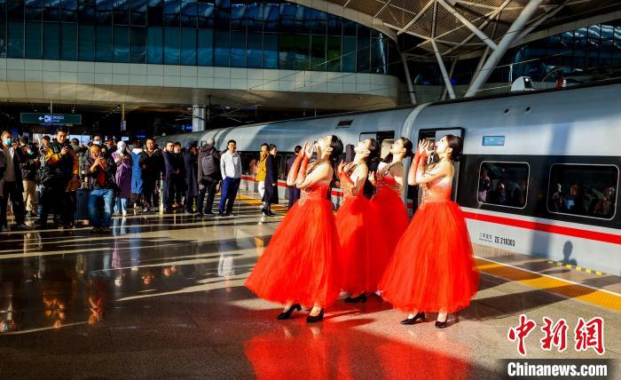 圖為工作人員在武漢站站臺上表演節(jié)目。中新社記者 張暢 攝