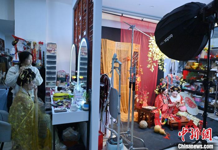 1月6日,吉林長春,化妝師在為市民做造型。店家介紹,農(nóng)歷蛇年春節(jié)將至,漢服寫真成了顧客新需求,店家特推出百梅迎春、金蛇賀歲、招財進寶等主題,深受市民喜愛。中新社記者 張瑤 攝