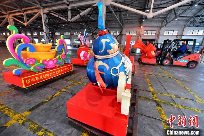 1月7日,第二十三屆“兩馬同春鬧元宵”活動(dòng)馬尾贈(zèng)予馬祖的花燈,在福州青州集裝箱碼頭裝箱?!≈行律缬浾?張斌 攝