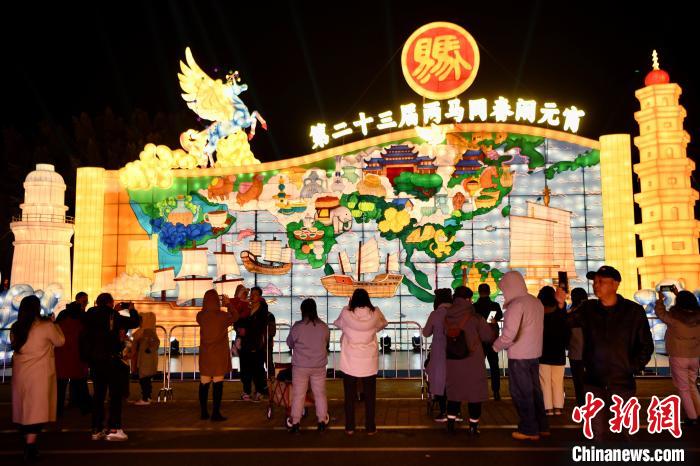 1月9日晚,第二十三屆“兩馬同春鬧元宵”亮燈,圖為紅光湖中央的“國泰民安”燈組吸引游人觀看。中新社記者 王東明 攝