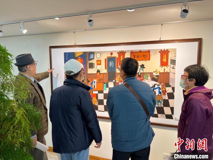 1月18日,“2025‘年’在一起 兩岸春聯(lián)年畫漫畫展”在臺北江山如此多嬌藝術(shù)館開幕,民眾在現(xiàn)場欣賞展出的漫畫作品《年夜飯》。中新社記者 路梅 攝