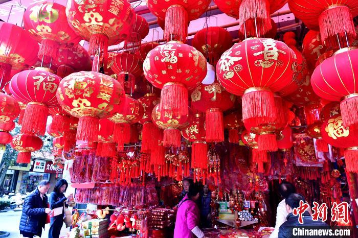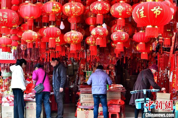 1月19日,市民在選購春節(jié)飾品。春節(jié)臨近,福州市民忙著選購春聯(lián)、中國結(jié)、紅燈籠等年貨。中新社記者 張斌 攝