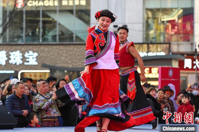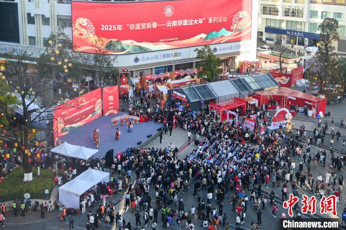 1月23日,演員在昆明南屏步行街巡演“目瑙縱歌”。當(dāng)日,2025年“非遺賀新春——云南非遺過(guò)大年”系列活動(dòng)在昆明市啟動(dòng),舞龍、舞獅、新年巡游等傳統(tǒng)春節(jié)習(xí)俗為市民帶來(lái)沉浸式的年味盛宴。中新社記者 李嘉嫻 攝