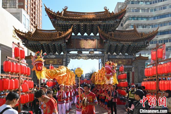 1月23日,舞龍隊(duì)伍在昆明南屏步行街巡游賀新春。中新社記者 李嘉嫻 攝