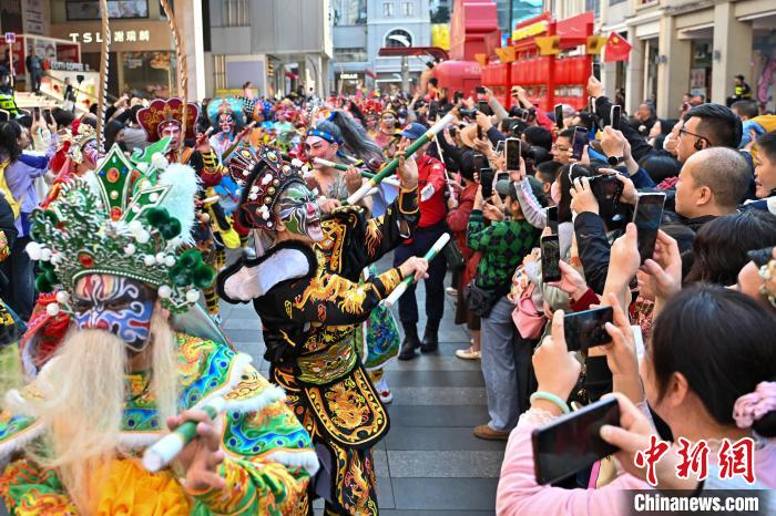1月25日,廣東廣州,已有百年歷史的西湖花市開市迎客。圖為西湖花市開市巡游活動中的英歌舞表演吸引市民。中新社記者 陳驥旻 攝